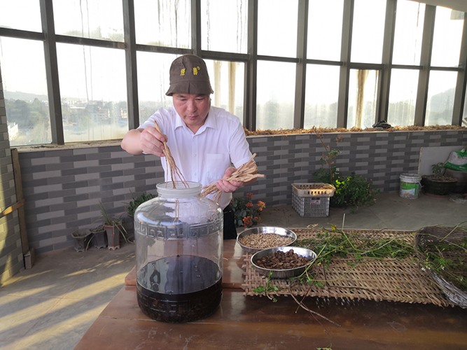 壯藥整骨水的配制是經(jīng)歷代祖?zhèn)魉幏脚c長(zhǎng)時(shí)間行醫(yī)診治的實(shí)踐經(jīng)驗(yàn)相結(jié)合,將多種地道中草藥通過嚴(yán)格配比制備而成。壯藥整骨水的傳承人之一李燮中,男,蒼梧人,出生于岐黃世家,自小隨祖上學(xué)醫(yī),精通醫(yī)藥。為傳承民間醫(yī)術(shù),其子李燕強(qiáng)從小就跟隨在李燮中身邊從醫(yī)學(xué)藥,親歷傳授,李燮中把祖上的藥方和行醫(yī)經(jīng)驗(yàn)傳授給李燕強(qiáng),再由李燕強(qiáng)傳授給李浪輝。李燮中于1981年在蒼梧創(chuàng)立了本地第一間藥店—福樂藥店(強(qiáng)壽藥業(yè)集團(tuán)的前身),藥店為蒼梧涼茶的發(fā)展和民間傳統(tǒng)醫(yī)藥的傳承起到了承上啟下的貢獻(xiàn),造福當(dāng)?shù)匕傩?。李浪輝從小就隨著祖父李燮中和父親李燕強(qiáng)一起從醫(yī)學(xué)藥,并樹立了要發(fā)展、壯大、振興民族醫(yī)藥產(chǎn)業(yè)的決心。李浪輝時(shí)常與家人行走在山間田野采摘草藥,并做成相應(yīng)的標(biāo)本,用于進(jìn)行各種藥物的臨床研究與探索,對(duì)傳統(tǒng)醫(yī)藥有著傳承與發(fā)展的強(qiáng)烈責(zé)任感,尤其是對(duì)民間醫(yī)藥非物質(zhì)文化遺產(chǎn)的簡(jiǎn)、廉、便、效、捷等方面?zhèn)鞒姓莆罩?dú)特的技巧。經(jīng)過祖父、父親的傳承與創(chuàng)新發(fā)展,李浪輝掌握了多項(xiàng)民間傳承的非遺物質(zhì)文化項(xiàng)目及技術(shù)。如:蒼梧桑寄生茶、蒼梧涼茶、壯藥整骨水、整骨器具、椎墊等多項(xiàng)技術(shù)的核心制作技巧,以及獨(dú)特的制作工藝。傳統(tǒng)中醫(yī)藥是中華民族獻(xiàn)給世界人民最好的禮物,發(fā)揚(yáng)國(guó)粹,寄望傳承,將歷代的醫(yī)術(shù)傳承下去,造福人類,是岐黃世家李氏家族義不容辭的責(zé)任和使命。